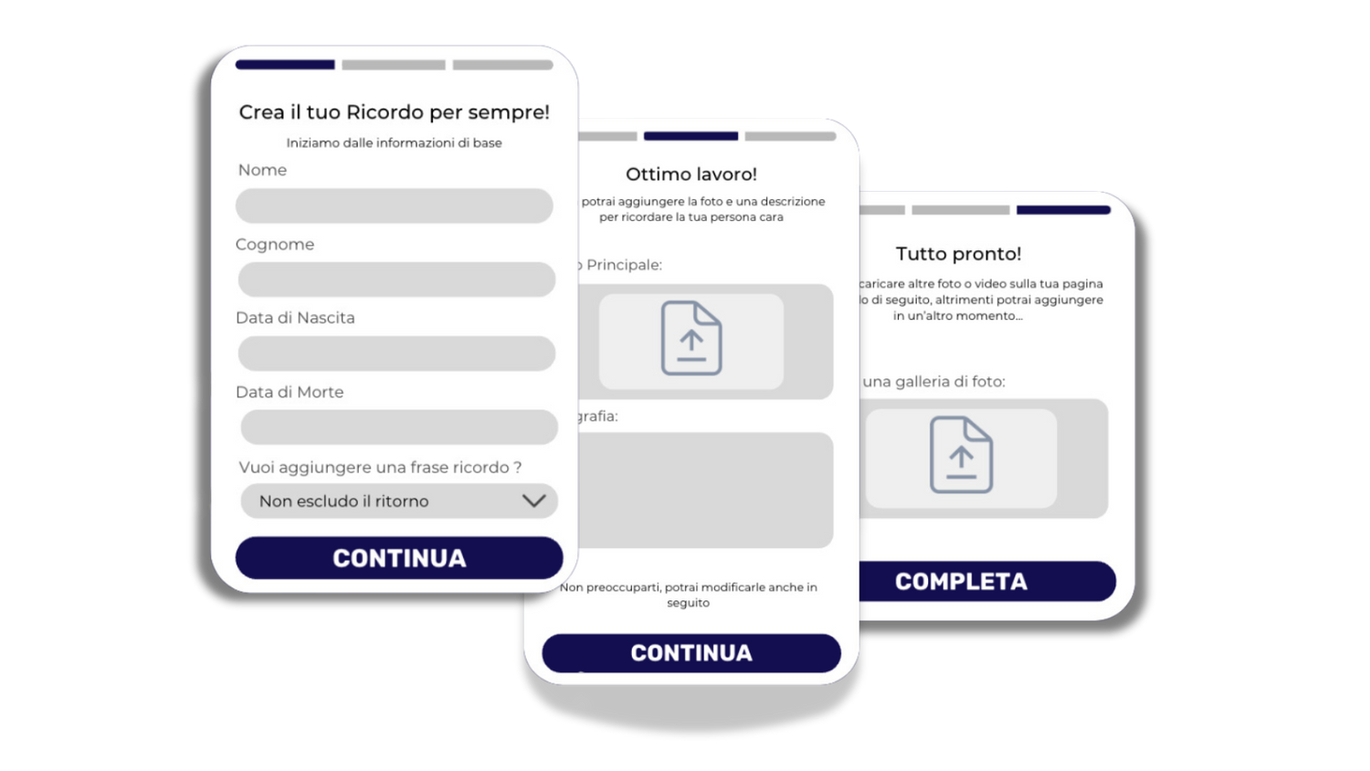 Dopo aver effettuato l'acquisto riceverai un modulo dove caricare tutte le informazioni sul tuo caro. Non reoccuparti se non hai tutte le foto pronte subito potrai aggiungere in seguito.