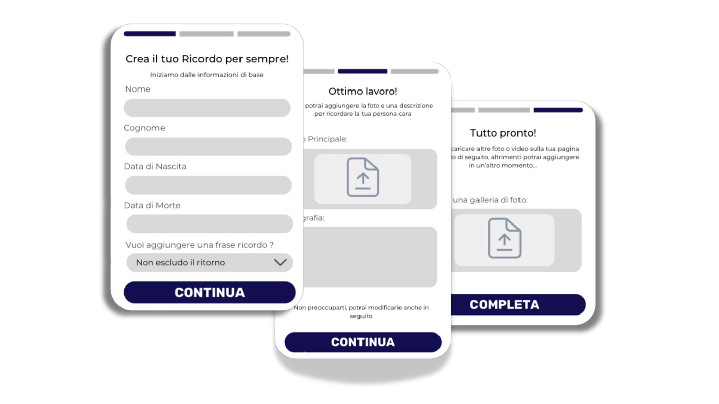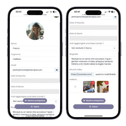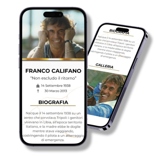 Effettuato l’acquisto riceverai immediatamente un link dove caricare i Biografia ed immagini. Non preoccuparti se non hai tutto pronto da subito potrai caricare altro in seguito. Una volta fatto la pagina verrà generata automaticamente.
